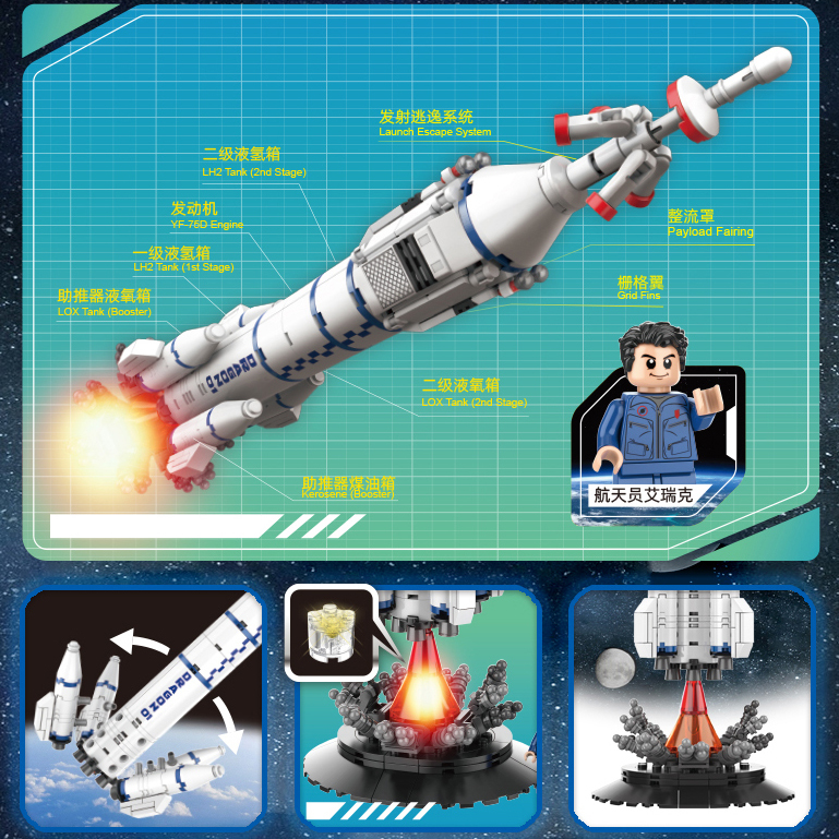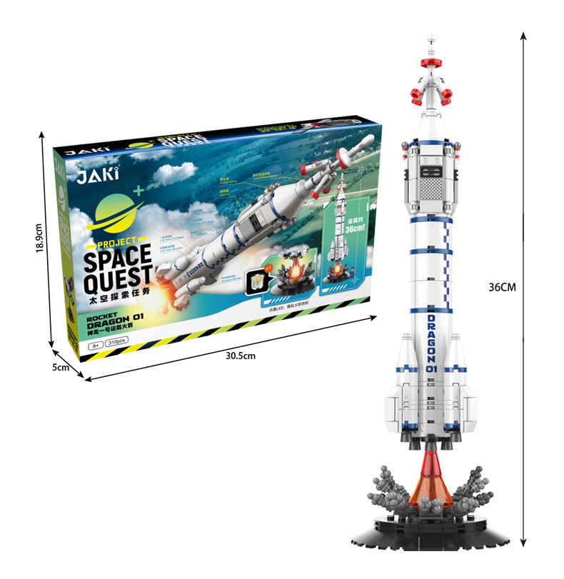 運載火箭能將各種航天器推向太空。神龍一號運載火箭通體潔白,全高約36cm,火箭總體由四個液體助推器、芯一級火箭、芯二級火箭、整流罩和逃逸塔組成。配套有火箭噴射底座,尾部內部LED燈可模擬火箭點火狀態,配套一名航天員人仔,為你再現火箭升空的壯觀場景!