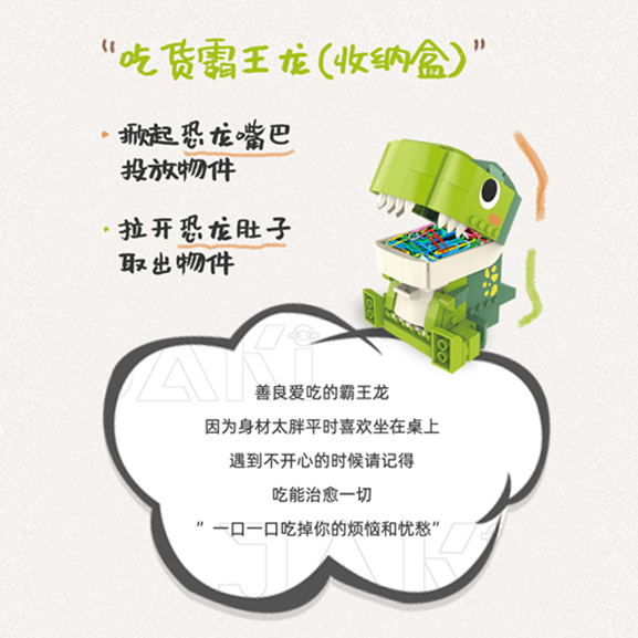善良愛吃的霸王龍, 因?yàn)樯聿奶制綍r(shí)喜歡坐在桌上, 遇到不開心的時(shí)候, 請記得吃能治愈一切, 一口一口吃掉你的煩惱和憂愁”